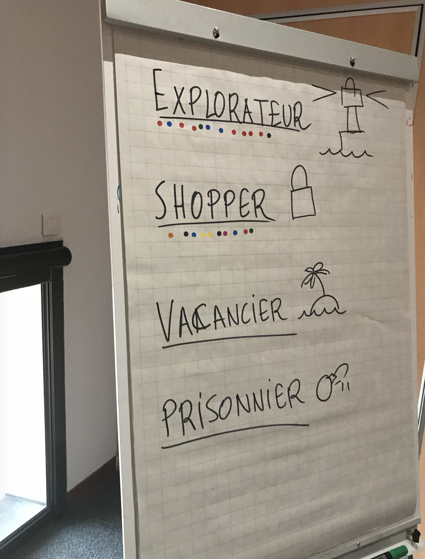 - Préparez un tableau avec les quatre catégories : Explorateur, Shopper, Vacancier, Prisonnier